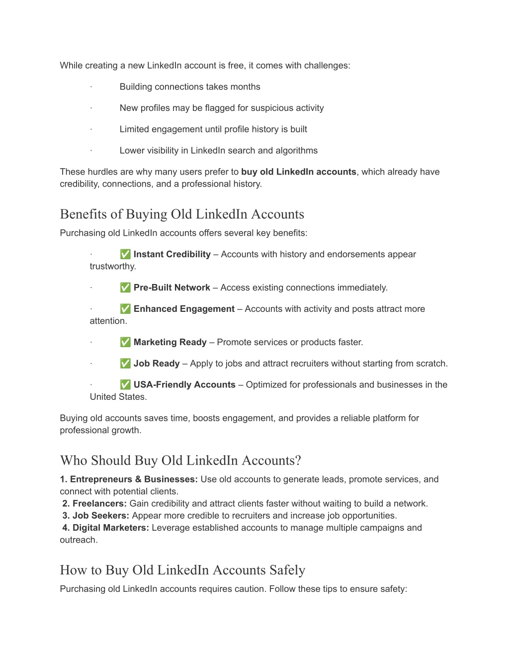 While creating a new LinkedIn account is free, it comes with challenges: Building connections takes months · New profiles may be flagged for suspicious activity · Limited engagement until profile history is built · Lower visibility in LinkedIn search and algorithms · These hurdles are why many users prefer to buy old LinkedIn accounts, which already have credibility, connections, and a professional history. Benefits of Buying Old LinkedIn Accounts Purchasing old LinkedIn accounts offers several key benefits: ✅Instant Credibility – Accounts with history and endorsements appear · trustworthy. ✅Pre-Built Network – Access existing connections immediately. · ✅Enhanced Engagement – Accounts with activity and posts attract more · attention. ✅Marketing Ready – Promote services or products faster. · ✅Job Ready – Apply to jobs and attract recruiters without starting from scratch. · ✅USA-Friendly Accounts – Optimized for professionals and businesses in the · United States. Buying old accounts saves time, boosts engagement, and provides a reliable platform for professional growth. Who Should Buy Old LinkedIn Accounts? 1. Entrepreneurs & Businesses: Use old accounts to generate leads, promote services, and connect with potential clients. 2. Freelancers: Gain credibility and attract clients faster without waiting to build a network. 3. Job Seekers: Appear more credible to recruiters and increase job opportunities. 4. Digital Marketers: Leverage established accounts to manage multiple campaigns and outreach. How to Buy Old LinkedIn Accounts Safely Purchasing old LinkedIn accounts requires caution. Follow these tips to ensure safety: