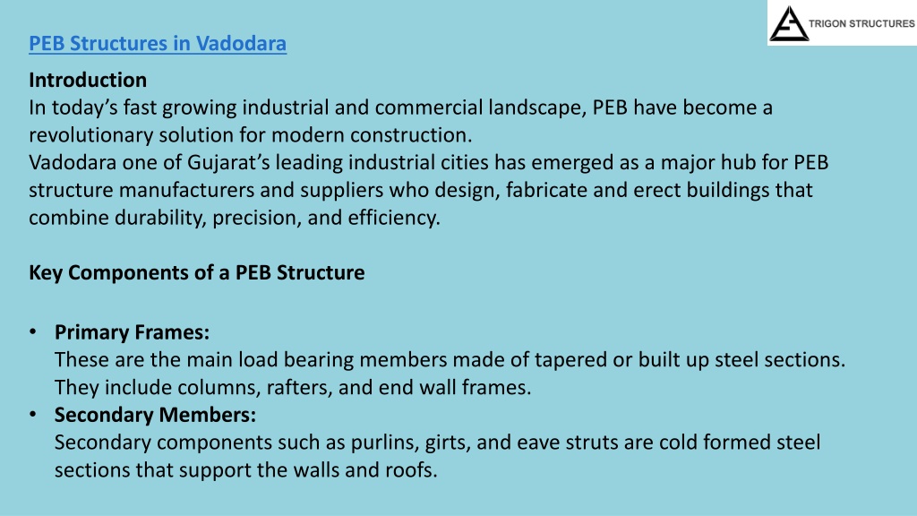 PEB Structures in Vadodara • Introduction • In today’s fast growing industrial and commercial landscape, PEBhave become a revolutionary solution for modern construction. • Vadodara one of Gujarat’s leading industrial cities has emerged as a major hub for PEB structure manufacturers and suppliers who design, fabricate and erect buildings that combine durability, precision, and efficiency. • Key Components of a PEB Structure • Primary Frames:These are the main load bearing members made of tapered or built up steel sections. They include columns, rafters, and end wall frames. • Secondary Members:Secondary components such as purlins, girts, and eave struts are cold formed steel sections that support the walls and roofs.
