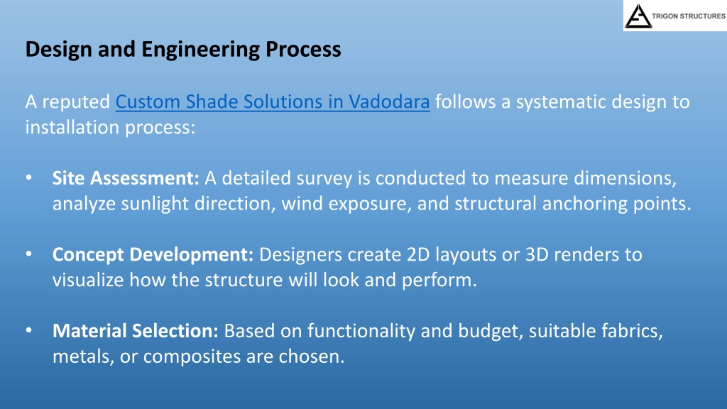 Design and Engineering Process • A reputed Custom Shade Solutions in Vadodara follows a systematic design to installation process: • Site Assessment: A detailed survey is conducted to measure dimensions, analyze sunlight direction, wind exposure, and structural anchoring points. • Concept Development: Designers create 2D layouts or 3D renders to visualize how the structure will look and perform. • Material Selection: Based on functionality and budget, suitable fabrics, metals, or composites are chosen.