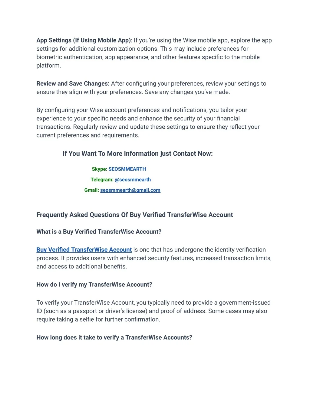 App Settings (If Using Mobile App): If you’re using the Wise mobile app, explore the app settings for additional customization options. This may include preferences for biometric authentication, app appearance, and other features specific to the mobile platform. Review and Save Changes: After configuring your preferences, review your settings to ensure they align with your preferences. Save any changes you’ve made. By configuring your Wise account preferences and notifications, you tailor your experience to your specific needs and enhance the security of your financial transactions. Regularly review and update these settings to ensure they reflect your current preferences and requirements. If You Want To More Information just Contact Now: Skype: SEOSMMEARTH Telegram: @seosmmearth Gmail: seosmmearth@gmail.com Frequently Asked Questions Of Buy Verified TransferWise Account What is a Buy Verified TransferWise Account? Buy Verified TransferWise Account is one that has undergone the identity verification process. It provides users with enhanced security features, increased transaction limits, and access to additional benefits. How do I verify my TransferWise Account? To verify your TransferWise Account, you typically need to provide a government-issued ID (such as a passport or driver’s license) and proof of address. Some cases may also require taking a selfie for further confirmation. How long does it take to verify a TransferWise Accounts?