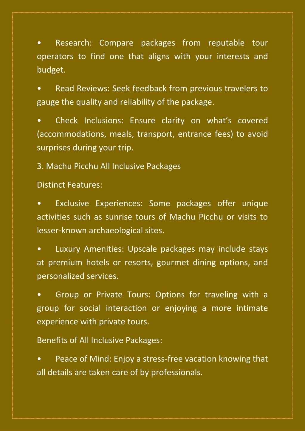 • operators to find one that aligns with your interests and budget. Research: Compare packages from reputable tour • gauge the quality and reliability of the package. Read Reviews: Seek feedback from previous travelers to • (accommodations, meals, transport, entrance fees) to avoid surprises during your trip. Check Inclusions: Ensure clarity on what’s covered 3. Machu Picchu All Inclusive Packages Distinct Features: • activities such as sunrise tours of Machu Picchu or visits to lesser-known archaeological sites. Exclusive Experiences: Some packages offer unique • at premium hotels or resorts, gourmet dining options, and personalized services. Luxury Amenities: Upscale packages may include stays • group for social interaction or enjoying a more intimate experience with private tours. Group or Private Tours: Options for traveling with a Benefits of All Inclusive Packages: • all details are taken care of by professionals. Peace of Mind: Enjoy a stress-free vacation knowing that
