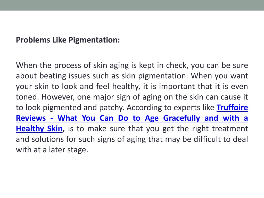 Problems Like Pigmentation: When the process of skin aging is kept in check, you can be sure about beating issues such as skin pigmentation. When you want your skin to look and feel healthy, it is important that it is even toned. However, one major sign of aging on the skin can cause it to look pigmented and patchy. According to experts like Truffoire Reviews - What You Can Do to Age Gracefully and with a Healthy Skin, is to make sure that you get the right treatment and solutions for such signs of aging that may be difficult to deal with at a later stage.