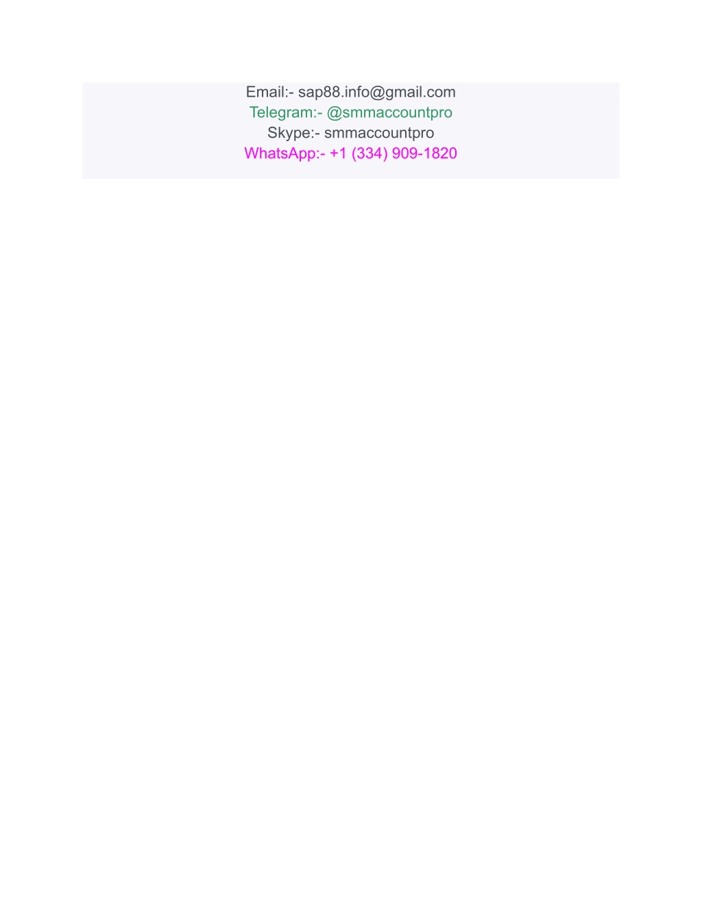 Email:- sap88.info@gmail.com Telegram:- @smmaccountpro Skype:- smmaccountpro WhatsApp:- +1 (334) 909-1820
