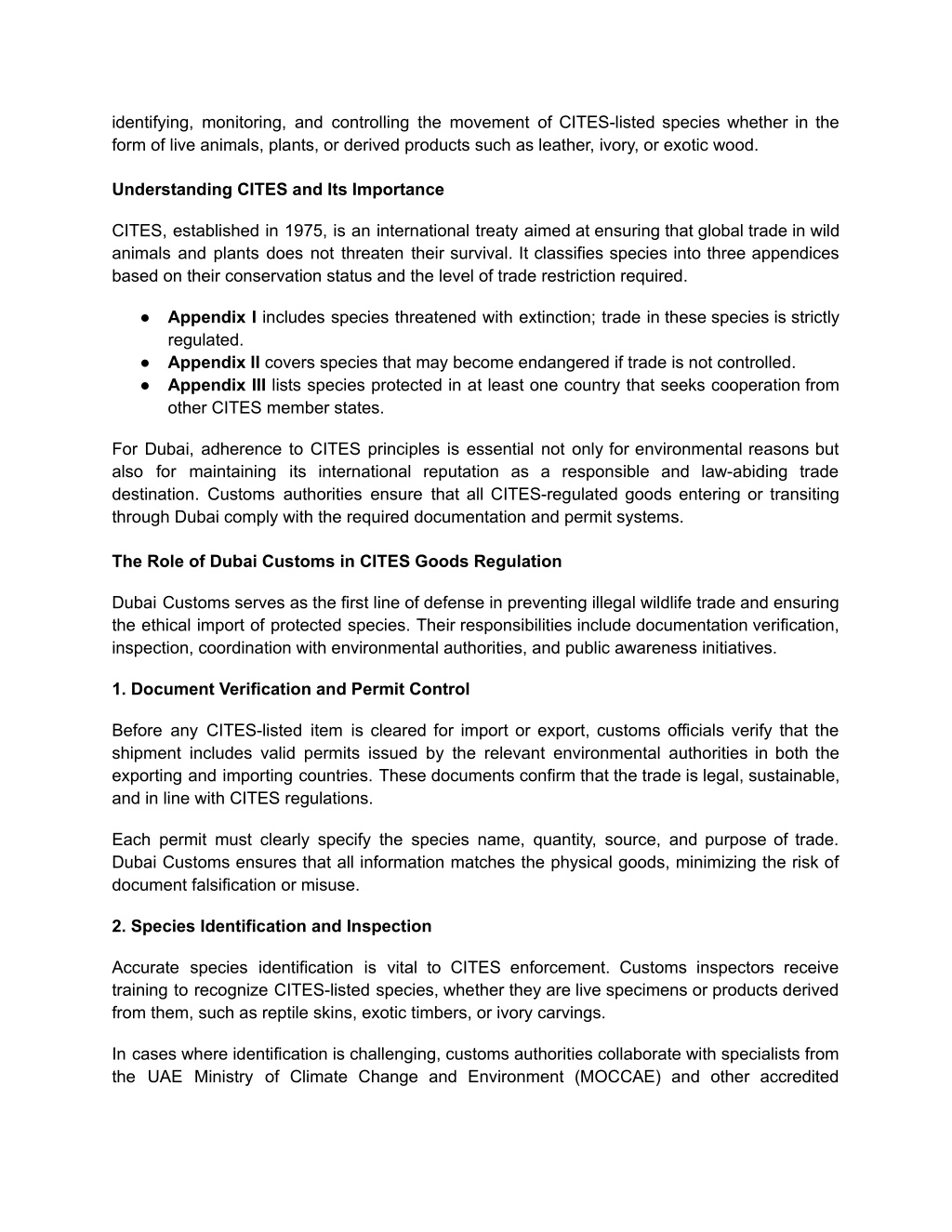 identifying, monitoring, and controlling the movement of CITES-listed species whether in the form of live animals, plants, or derived products such as leather, ivory, or exotic wood. Understanding CITES and Its Importance CITES, established in 1975, is an international treaty aimed at ensuring that global trade in wild animals and plants does not threaten their survival. It classifies species into three appendices based on their conservation status and the level of trade restriction required. ● Appendix I includes species threatened with extinction; trade in these species is strictly regulated. ● Appendix II covers species that may become endangered if trade is not controlled. ● Appendix III lists species protected in at least one country that seeks cooperation from other CITES member states. For Dubai, adherence to CITES principles is essential not only for environmental reasons but also for maintaining its international reputation as a responsible and law-abiding trade destination. Customs authorities ensure that all CITES-regulated goods entering or transiting through Dubai comply with the required documentation and permit systems. The Role of Dubai Customs in CITES Goods Regulation Dubai Customs serves as the first line of defense in preventing illegal wildlife trade and ensuring the ethical import of protected species. Their responsibilities include documentation verification, inspection, coordination with environmental authorities, and public awareness initiatives. 1. Document Verification and Permit Control Before any CITES-listed item is cleared for import or export, customs officials verify that the shipment includes valid permits issued by the relevant environmental authorities in both the exporting and importing countries. These documents confirm that the trade is legal, sustainable, and in line with CITES regulations. Each permit must clearly specify the species name, quantity, source, and purpose of trade. Dubai Customs ensures that all information matches the physical goods, minimizing the risk of document falsification or misuse. 2. Species Identification and Inspection Accurate species identification is vital to CITES enforcement. Customs inspectors receive training to recognize CITES-listed species, whether they are live specimens or products derived from them, such as reptile skins, exotic timbers, or ivory carvings. In cases where identification is challenging, customs authorities collaborate with specialists from the UAE Ministry of Climate Change and Environment (MOCCAE) and other accredited