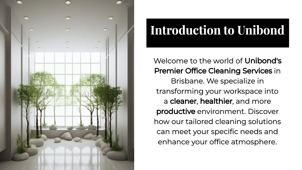 Introduction to Unibond Introduction to Unibond Welcome to the world of Unibond's Premier Office Cleaning Services in Brisbane. We specialize in transforming your workspace into a cleaner, healthier, and more productive environment. Discover how our tailored cleaning solutions can meet your specific needs and enhance your office atmosphere. enhance your office atmosphere. Welcome to the world of Unibond's Premier Office Cleaning Services in Brisbane. We specialize in transforming your workspace into a cleaner, healthier, and more productive environment. Discover how our tailored cleaning solutions can meet your specific needs and