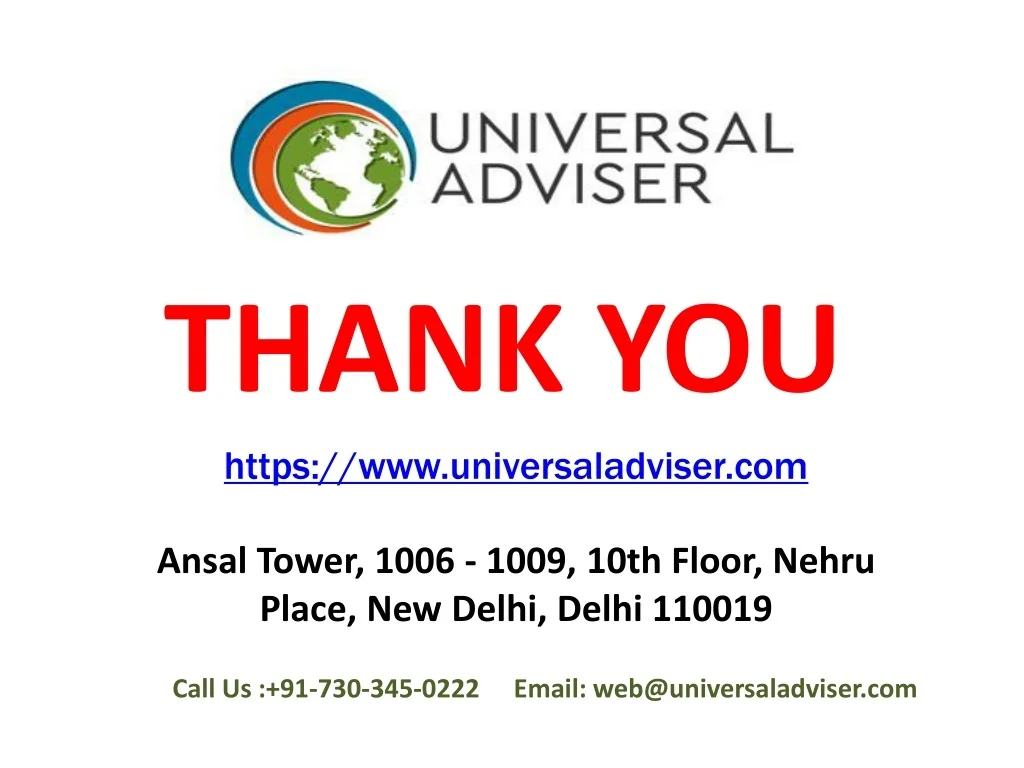 THANK YOU https://www.universaladviser.com Ansal Tower, 1006 - 1009, 10th Floor, Nehru Place, New Delhi, Delhi 110019 Call Us :+91-730-345-0222 Email: web@universaladviser.com