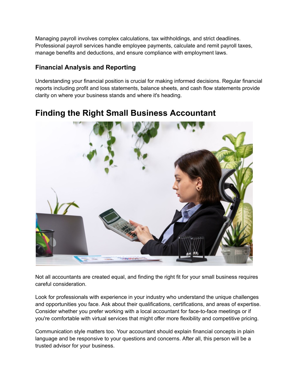 Managing payroll involves complex calculations, tax withholdings, and strict deadlines. Professional payroll services handle employee payments, calculate and remit payroll taxes, manage benefits and deductions, and ensure compliance with employment laws. Financial Analysis and Reporting Understanding your financial position is crucial for making informed decisions. Regular financial reports including profit and loss statements, balance sheets, and cash flow statements provide clarity on where your business stands and where it's heading. Finding the Right Small Business Accountant Not all accountants are created equal, and finding the right fit for your small business requires careful consideration. Look for professionals with experience in your industry who understand the unique challenges and opportunities you face. Ask about their qualifications, certifications, and areas of expertise. Consider whether you prefer working with a local accountant for face-to-face meetings or if you're comfortable with virtual services that might offer more flexibility and competitive pricing. Communication style matters too. Your accountant should explain financial concepts in plain language and be responsive to your questions and concerns. After all, this person will be a trusted advisor for your business.
