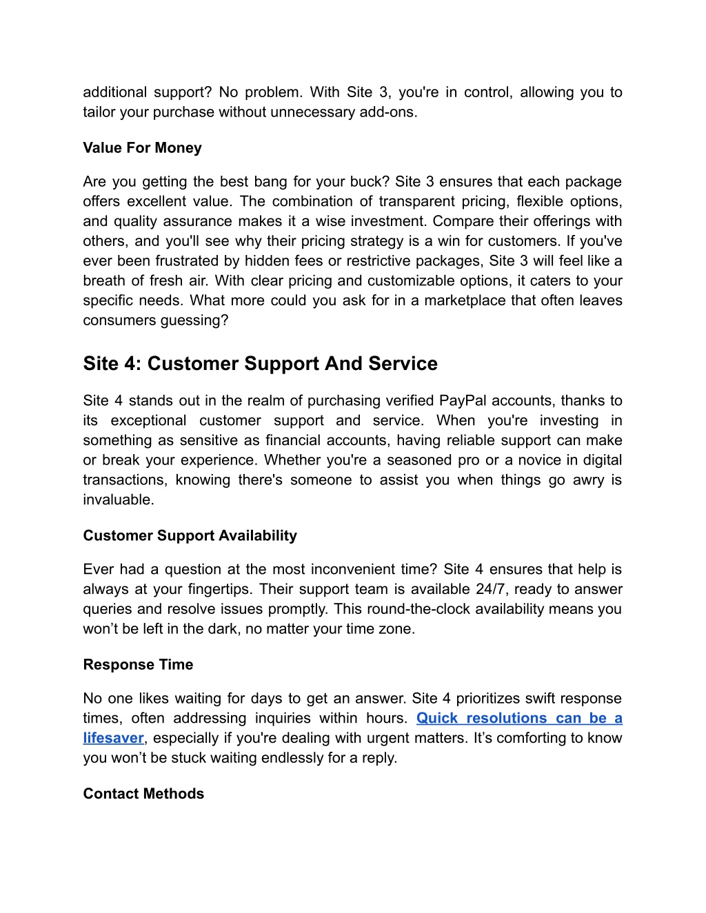 additional support? No problem. With Site 3, you're in control, allowing you to tailor your purchase without unnecessary add-ons. Value For Money Are you getting the best bang for your buck? Site 3 ensures that each package offers excellent value. The combination of transparent pricing, flexible options, and quality assurance makes it a wise investment. Compare their offerings with others, and you'll see why their pricing strategy is a win for customers. If you've ever been frustrated by hidden fees or restrictive packages, Site 3 will feel like a breath of fresh air. With clear pricing and customizable options, it caters to your specific needs. What more could you ask for in a marketplace that often leaves consumers guessing? Site 4: Customer Support And Service Site 4 stands out in the realm of purchasing verified PayPal accounts, thanks to its exceptional customer support and service. When you're investing in something as sensitive as financial accounts, having reliable support can make or break your experience. Whether you're a seasoned pro or a novice in digital transactions, knowing there's someone to assist you when things go awry is invaluable. Customer Support Availability Ever had a question at the most inconvenient time? Site 4 ensures that help is always at your fingertips. Their support team is available 24/7, ready to answer queries and resolve issues promptly. This round-the-clock availability means you won’t be left in the dark, no matter your time zone. Response Time No one likes waiting for days to get an answer. Site 4 prioritizes swift response times, often addressing inquiries within hours. Quick resolutions can be a lifesaver, especially if you're dealing with urgent matters. It’s comforting to know you won’t be stuck waiting endlessly for a reply. Contact Methods