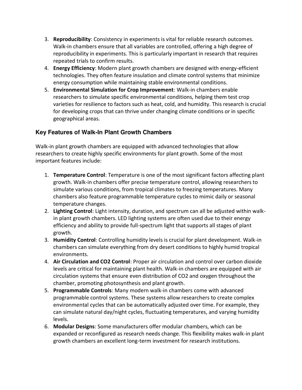 Weiss Technik, a global leader in environmental simulation technologies, offers a range of walk- in plant growth chambers. The company, headquartered in Germany, serves customers worldwide and is known for its state-of-the-art climate simulation chambers. Key Features: Weiss Technik walk-in chambers are designed for versatility, offering the ability to simulate a wide range of environmental conditions. They are equipped with advanced climate control systems that ensure uniform conditions throughout the chamber. Application Areas: Weiss Technik’s chambers are used in diverse industries, including agriculture, horticulture, and environmental research. They are known for their robust design and reliability in long-term experiments. Technological Advances: The company focuses on integrating modern technologies such as cloud-based monitoring systems, which allow researchers to track chamber conditions in real-time from anywhere in the world. 4. Darwin Chambers Darwin Chambers is a U.S.-based company specializing in environmental chambers, including walk-in plant growth chambers. The company prides itself on creating energy-efficient chambers that meet the highest industry standards. Key Features: Darwin walk-in plant growth chambers are customizable and come with features like adjustable light intensity, CO2 control, and advanced temperature and humidity regulation. They also offer unique features like high-performance insulation and environmental sustainability options. Application Areas: Darwin Chambers are used in agricultural research, biotechnology, and pharmaceutical industries, particularly for long-term experiments that require precise environmental control. Technological Advances: Darwin Chambers is known for its commitment to sustainability. The company designs chambers that are not only energy-efficient but also use eco-friendly materials and components. The Role of Walk-In Plant Growth Chambers in Research and Agriculture Walk-in plant growth chambers play an essential role in a wide range of scientific and agricultural applications. Here’s a closer look at how they are used in different fields: 1.Agricultural Research: Walk-in chambers allow researchers to study plant responses to environmental stressors such as drought, heat, and pests. This research is crucial for developing resilient crops that can withstand climate change and other challenges. 2.Biotechnology: In the biotechnology industry, walk-in chambers are used for growing genetically modified plants under controlled conditions. This enables scientists to conduct experiments on plant physiology, gene expression, and other critical aspects of plant biology.
