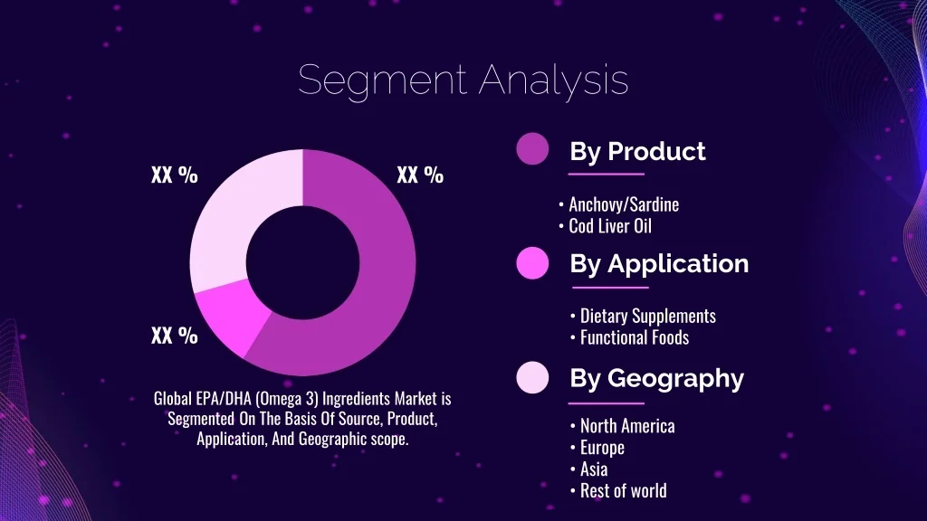 Segment Analysis By Product XX % XX % • • Anchovy/Sardine • • Cod Liver Oil • By Application • • Dietary Supplements • • Functional Foods XX % • By Geography • Global EPA/DHA (Omega 3) Ingredients Market is Segmented On The Basis Of Source, Product, Application, And Geographic scope. • • North America • • Europe • • Asia • • Rest of world