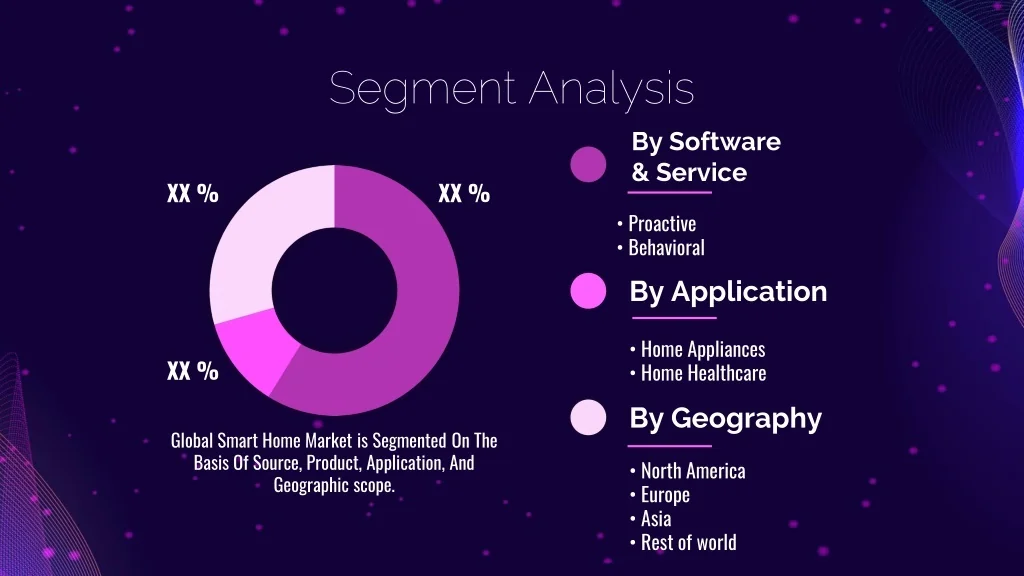 Segment Analysis By Software & Service XX % XX % • • Proactive • • Behavioral • By Application • • Home Appliances • • Home Healthcare XX % • By Geography • Global Smart Home Market is Segmented On The Basis Of Source, Product, Application, And Geographic scope. • • North America • • Europe • • Asia • • Rest of world