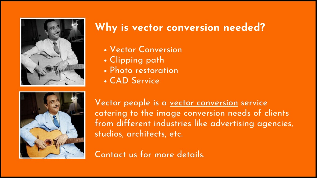 Why is vector conversion needed? Vector Conversion Clipping path Photo restoration CAD Service Vector people is a vector conversion service catering to the image conversion needs of clients from different industries like advertising agencies, studios, architects, etc. Contact us for more details.