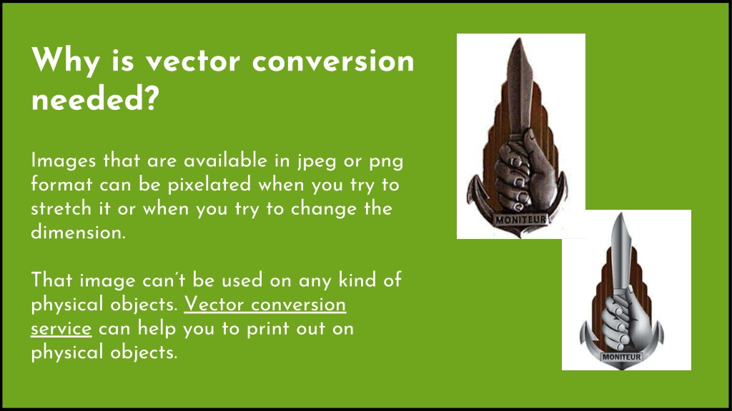 Why is vector conversion needed? Images that are available in jpeg or png format can be pixelated when you try to stretch it or when you try to change the dimension. That image can’t be used on any kind of physical objects. Vector conversion service can help you to print out on physical objects.