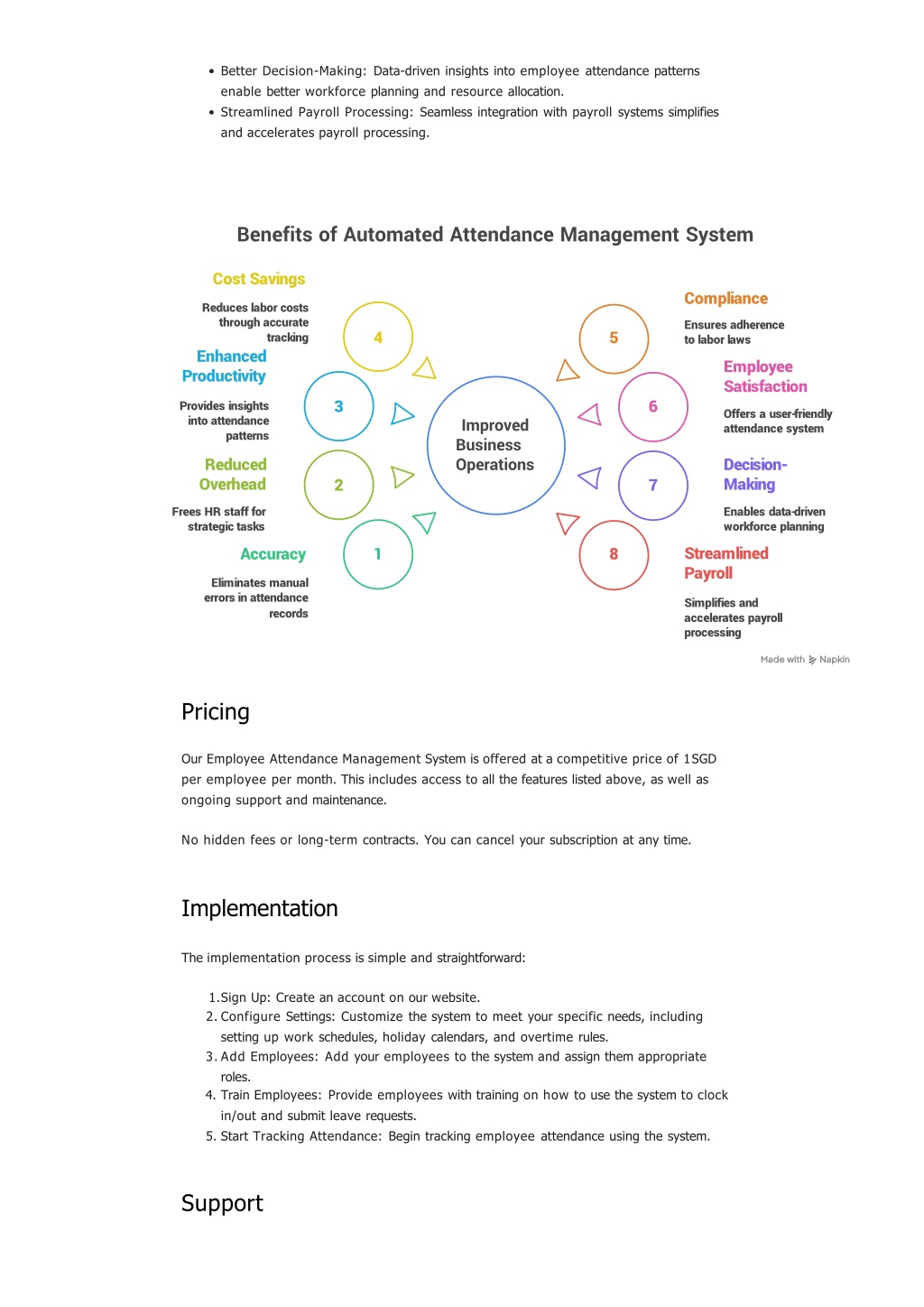 BetterDecision-Making:Data-driveninsightsintoemployeeattendancepatterns enablebetterworkforceplanningandresourceallocation. • StreamlinedPayrollProcessing:Seamlessintegrationwithpayrollsystemssimplifies andacceleratespayrollprocessing. BenefitsofAutomatedAttendanceManagementSystem CostSavings Reduceslaborcosts throughaccurate tracking Enhanced Productivity Providesinsights intoattendance patterns Compliance Ensuresadherence tolabor laws Employee Satisfaction Offersauser-friendly attendancesystem 4 5 3 6 Improved Business Operations Reduced Overhead FreesHRstafffor strategictasks Accuracy Eliminatesmanual errorsinattendance records Decision- Making Enablesdata-driven workforceplanning Streamlined Payroll Simplifiesand acceleratespayroll processing 2 7 1 8 Pricing OurEmployeeAttendanceManagementSystemisofferedatacompetitivepriceof1SGD peremployeepermonth.Thisincludes accesstoallthefeatureslistedabove, aswellas ongoingsupportandmaintenance. Nohiddenfeesorlong-term contracts.Youcancancelyoursubscriptionatanytime. Implementation Theimplementationprocessissimpleandstraightforward: SignUp:Createanaccountonourwebsite. Configure Settings:Customizethesystemtomeetyourspecificneeds,including settingupworkschedules,holidaycalendars,andovertimerules. AddEmployees:Addyour employeestothesystemandassignthemappropriate roles. TrainEmployees:Provideemployeeswithtrainingonhowtousethesystemtoclock in/out andsubmitleaverequests. StartTrackingAttendance:Begintrackingemployeeattendanceusingthesystem. Support