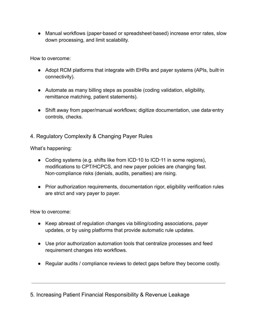 ● Manual workflows (paper‑based or spreadsheet‑based) increase error rates, slow down processing, and limit scalability. How to overcome: ● Adopt RCM platforms that integrate with EHRs and payer systems (APIs, built‑in connectivity). ● Automate as many billing steps as possible (coding validation, eligibility, remittance matching, patient statements). ● Shift away from paper/manual workflows; digitize documentation, use data‑entry controls, checks. 4. Regulatory Complexity & Changing Payer Rules What’s happening: ● Coding systems (e.g. shifts like from ICD‑10 to ICD‑11 in some regions), modifications to CPT/HCPCS, and new payer policies are changing fast. Non‑compliance risks (denials, audits, penalties) are rising. ● Prior authorization requirements, documentation rigor, eligibility verification rules are strict and vary payer to payer. How to overcome: ● Keep abreast of regulation changes via billing/coding associations, payer updates, or by using platforms that provide automatic rule updates. ● Use prior authorization automation tools that centralize processes and feed requirement changes into workflows. ● Regular audits / compliance reviews to detect gaps before they become costly. 5. Increasing Patient Financial Responsibility & Revenue Leakage