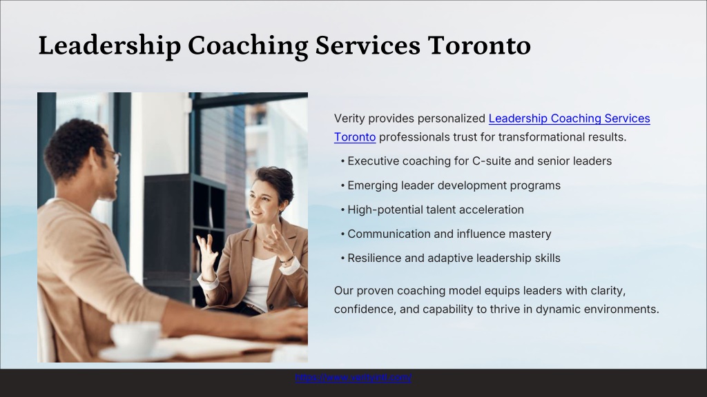 https://www.verityintl.com/ Leadership Coaching Services Toronto Verity provides personalized Leadership Coaching Services Toronto professionals trust for transformational results. • Executive coaching for C-suite and senior leaders • Emerging leader development programs • High-potential talent acceleration • Communication and influence mastery • Resilience and adaptive leadership skills Our proven coaching model equips leaders with clarity, confidence, and capability to thrive in dynamic environments.