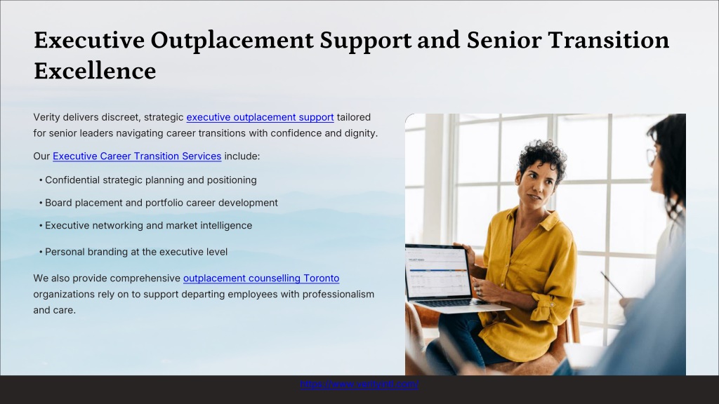https://www.verityintl.com/ Executive Outplacement Support and Senior Transition Excellence Verity delivers discreet, strategic executive outplacement support tailored for senior leaders navigating career transitions with confidence and dignity. Our Executive Career Transition Services include: • Confidential strategic planning and positioning • Board placement and portfolio career development • Executive networking and market intelligence • Personal branding at the executive level We also provide comprehensive outplacement counselling Toronto organizations rely on to support departing employees with professionalism and care.