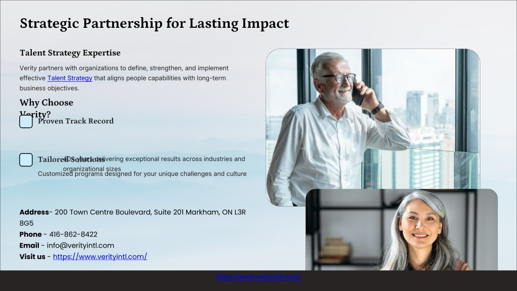 https://www.verityintl.com/ Strategic Partnership for Lasting Impact Talent Strategy Expertise Verity partners with organizations to define, strengthen, and implement effective Talent Strategy that aligns people capabilities with long-term business objectives. Why Choose Verity? Proven Track Record 40+ years delivering exceptional results across industries and organizational sizes Tailored Solutions Customized programs designed for your unique challenges and culture Address- 200 Town Centre Boulevard, Suite 201 Markham, ON L3R 8G5 Phone - 416-862-8422 Email - info@verityintl.com Visit us - https://www.verityintl.com/