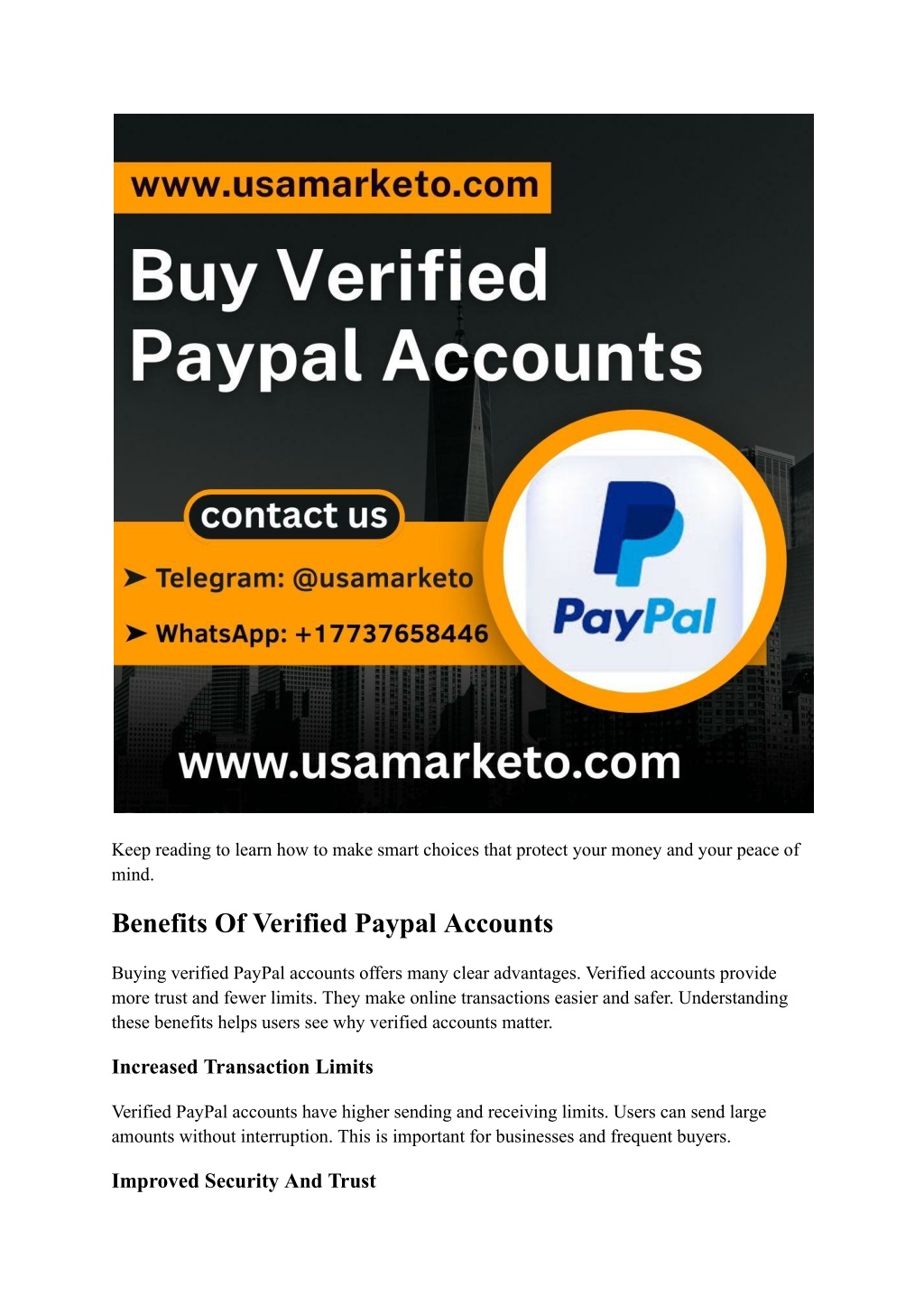 Are you looking to buy verified PayPal accounts but unsure where to start? Youu2019re not alone.<br>Having a verified PayPal account can open doors to smoother online transactions, higher limits, and better security. But finding a trustworthy source can be tricky. Youu2019ll discover exactly what verified PayPal accounts are, why they matter for your online business or personal use, and how to buy them safely.<br>If you want to know more information, contact us u2013<br>u27a4 WhatsApp: 17737658446<br>u27a4 Telegram: @usamarketo<br>u27a4 Email: usamarketo74@gmail.com<br>https://usamarketo.com/product/buy-verified-paypal-accounts/ <br> <br>