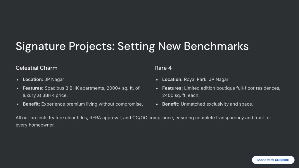 Signature Projects: Setting New Benchmarks Celestial Charm Rare 4 Location: JP Nagar Location: Royal Park, JP Nagar Features: Spacious 3 BHK apartments, 2000+ sq. ft. of luxury at 3BHK price. Features: Limited edition boutique full-floor residences, 2400 sq. ft. each. Benefit: Experience premium living without compromise. Benefit: Unmatched exclusivity and space. All our projects feature clear titles, RERA approval, and CC/OC compliance, ensuring complete transparency and trust for every homeowner.
