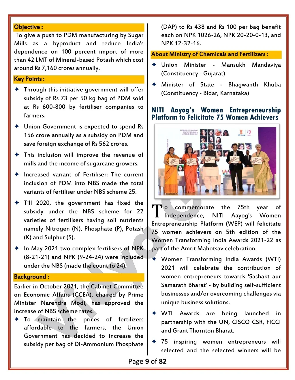 Objective Objective : : To give a push to PDM manufacturing by Sugar Mills as a byproduct and reduce India's dependence on 100 percent import of more than 42 LMT of Mineral-based Potash which cost around Rs 7,160 crores annually. Key Points Key Points : : (DAP) to Rs 438 and Rs 100 per bag benefit each on NPK 1026-26, NPK 20-20-0-13, and NPK 12-32-16. About Ministry of Chemicals and Fertilizers About Ministry of Chemicals and Fertilizers : : Union Minister - Mansukh Mandaviya (Constituency - Gujarat) Minister of State - Bhagwanth Khuba (Constituency - Bidar, Karnataka) NITI Aayog’s Women Entrepreneurship Platform to Felicitate 75 Women Achievers Through this initiative government will offer subsidy of Rs 73 per 50 kg bag of PDM sold at Rs 600-800 by fertiliser companies to farmers. Union Government is expected to spend Rs 156 crore annually as a subsidy on PDM and save foreign exchange of Rs 562 crores. This inclusion will improve the revenue of mills and the income of sugarcane growers. Increased variant of Fertiliser: The current inclusion of PDM into NBS made the total variants of fertiliser under NBS scheme 25. T Till 2020, the government has fixed the subsidy under the NBS scheme for 22 varieties of fertilisers having soil nutrients namely Nitrogen (N), Phosphate (P), Potash (K) and Sulphur (S). o commemorate the 75th year of Independence, NITI Entrepreneurship Platform (WEP) will felicitate 75 women achievers on 5th edition of the Women Transforming India Awards 2021-22 as part of the Amrit Mahotsav celebration. Aayog's Women In May 2021 two complex fertilisers of NPK (8-21-21) and NPK (9-24-24) were included under the NBS (made the count to 24). Women Transforming India Awards (WTI) 2021 will celebrate the contribution of women entrepreneurs towards 'Sashakt aur Samarath Bharat' - by building self-sufficient businesses and/or overcoming challenges via unique business solutions. Background Background : : Earlier in October 2021, the Cabinet Committee on Economic Affairs (CCEA), chaired by Prime Minister Narendra Modi, has approved the increase of NBS scheme rates. To maintain the prices of fertilizers affordable to the farmers, the Union Government has decided to increase the subsidy per bag of Di-Ammonium Phosphate WTI Awards are being launched in partnership with the UN, CISCO CSR, FICCI and Grant Thornton Bharat. 75 inspiring women entrepreneurs will selected and the selected winners will be Page 9 of 82
