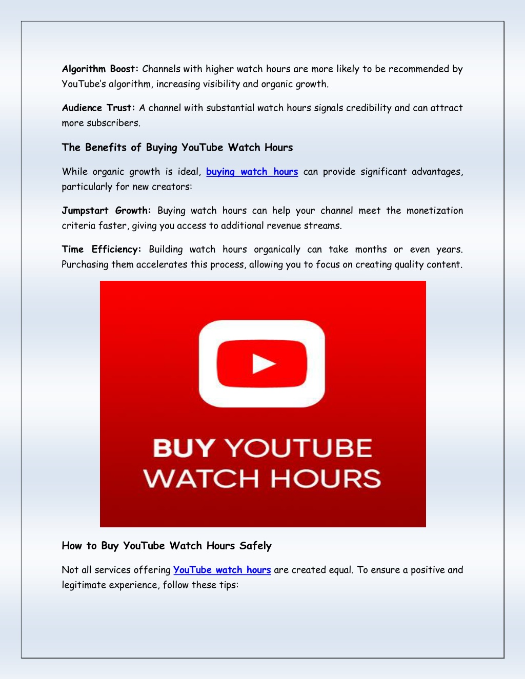 Algorithm Boost: Channels with higher watch hours are more likely to be recommended by YouTube’s algorithm, increasing visibility and organic growth. Audience Trust: A channel with substantial watch hours signals credibility and can attract more subscribers. The Benefits of Buying YouTube Watch Hours While organic growth is ideal, buying watch hours can provide significant advantages, particularly for new creators: Jumpstart Growth: Buying watch hours can help your channel meet the monetization criteria faster, giving you access to additional revenue streams. Time Efficiency: Building watch hours organically can take months or even years. Purchasing them accelerates this process, allowing you to focus on creating quality content. How to Buy YouTube Watch Hours Safely Not all services offering YouTube watch hours are created equal. To ensure a positive and legitimate experience, follow these tips: