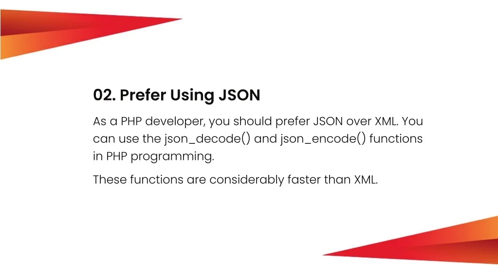 02. Prefer Using JSON As a PHP developer, you should prefer JSON over XML. You can use the json_decode() and json_encode() functions in PHP programming. These functions are considerably faster than XML.