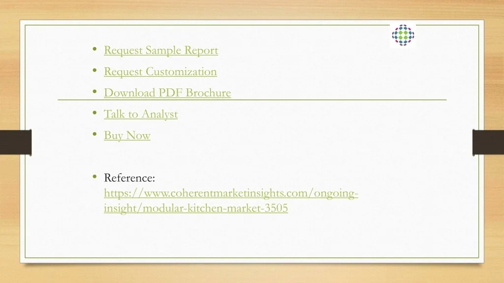 Request Sample Report • Request Customization • Download PDF Brochure • Talk to Analyst • Buy Now • Reference: https://www.coherentmarketinsights.com/ongoing-insight/modular-kitchen-market-3505