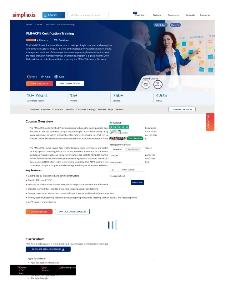 It enhances your chance of getting a good job as there is a lot of scope in Agile project development methodologies The PMI-ACP professional can bring positive outcomes in business by applying the diversi?ed methods of project management Why Simpliaxis? Career Advancement Forget those expensive degree-based learning and development initiatives and accelerate your career with web-based enterprise learning courses certi?ed by reputed governing bodies. Learners, as well as employees, prefer these corporate learning solutions due to ?exibility. Our healthy learning environment empowers you to progress at your own momentum without investing in time-consuming and expensive training programs. Your rate of digesting information should not de?ne your success. Instead, you'll get the same value and your desired career advancement without making a hole in your pocket. Grab the eyes of potential recruiters and let your resume stand apart from the crowd.. Cost-e?ective solutions Our corporate learning solutions are overall cost-e?ective for both facilitators and learners as, on the one hand, remote education cuts transportation costs, resources costs, and other crucial costs drastically. The upkeep costs are also more economical than in-person training sessions. Instead, the teams invest in real-world applications while cutting the course cost and ensuring learners' engagement. On the other hand, our o?ine training sessions help organizations create a winning corporate culture that ultimately invests in boosting employee engagement and productivity. One training session consists of maximum aspirants and employees and reduces the overall training budget. In short, now no one can hinder your career growth as you will be able to access job-driven advanced courses without making a hole in your pocket. Learn from Anywhere Anytime Simpliaxis has opened a new door of success for professionals by allowing them to attend web-based career advancement courses. Learners can enroll in corporate learning programs from anywhere globally to assist organizations that run multiple branches simultaneously around the globe. Learners can reclaim technology- empowered location-independent lifestyles without sacri?cing their career goals. Kick-start your growth story and make headway towards a rewarding career path from anywhere, anytime, without taking a break from your career Why SimpliAxis Is The First Choice For Corporates? Simpliaxis provides In person and live virtual instructor-led corporate training program customized for enterprise teams who wish to train their employees on speci?c aspects of their job processes or responsibilities. The corporate training by our expert certi?ed trainers will enhance your learning curve and enable your teams to utilize their skills to meet the industry standards. The tool-based learning, guiding, tracking, and grading ➤ Customized curriculum as per the team's and company's needs ➤ A pool of consultants catering to the work experience across industries ➤ Flexibility in learning- Online, O?ine, and Self paced learning ➤ Training oriented towards solving the problems ➤ Driving the teams toward the business objectives ➤ The global presence and can train the teams across the geographies ➤ 40+ Certi?cation programs made an impact Employee retention improved by 45% Work satisfaction and capabilities improved by 30% on an average CORPORATE GROUP ENQUIRY 100+ Clients Our PMI-Agile Certi?ed Practitioner (PMI-ACP®) Certi?cation Training Trainers