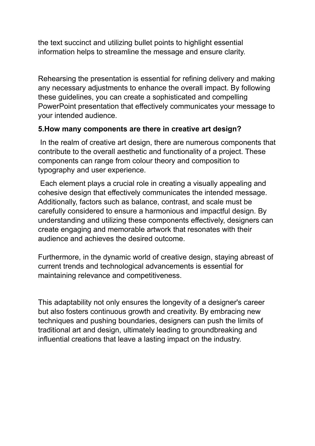 the text succinct and utilizing bullet points to highlight essential information helps to streamline the message and ensure clarity. Rehearsing the presentation is essential for refining delivery and making any necessary adjustments to enhance the overall impact. By following these guidelines, you can create a sophisticated and compelling PowerPoint presentation that effectively communicates your message to your intended audience. 5.How many components are there in creative art design? In the realm of creative art design, there are numerous components that contribute to the overall aesthetic and functionality of a project. These components can range from colour theory and composition to typography and user experience. Each element plays a crucial role in creating a visually appealing and cohesive design that effectively communicates the intended message. Additionally, factors such as balance, contrast, and scale must be carefully considered to ensure a harmonious and impactful design. By understanding and utilizing these components effectively, designers can create engaging and memorable artwork that resonates with their audience and achieves the desired outcome. Furthermore, in the dynamic world of creative design, staying abreast of current trends and technological advancements is essential for maintaining relevance and competitiveness. This adaptability not only ensures the longevity of a designer's career but also fosters continuous growth and creativity. By embracing new techniques and pushing boundaries, designers can push the limits of traditional art and design, ultimately leading to groundbreaking and influential creations that leave a lasting impact on the industry.