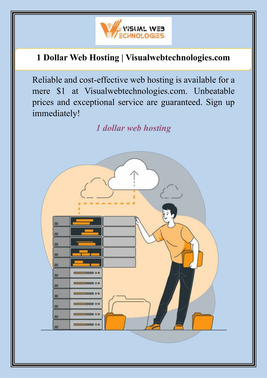 1 Dollar Web Hosting | Visualwebtechnologies.com Reliable and cost-effective web hosting is available for a mere $1 at Visualwebtechnologies.com. Unbeatable prices and exceptional service are guaranteed. Sign up immediately! 1 dollar web hosting
