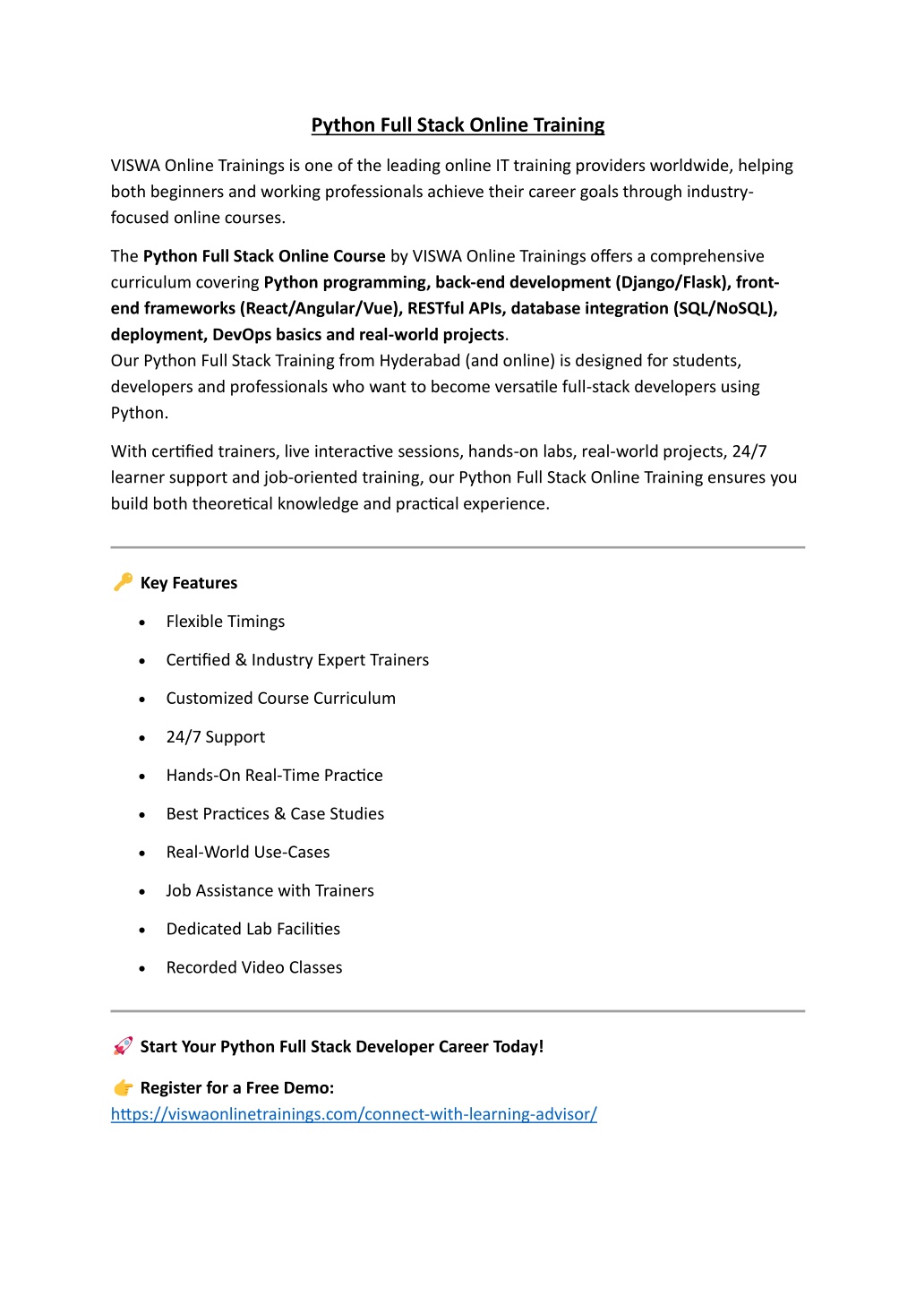 Python Full Stack Online Training VISWA Online Trainings is one of the leading online IT training providers worldwide, helping both beginners and working professionals achieve their career goals through industry- focused online courses. The Python Full Stack Online Course by VISWA Online Trainings offers a comprehensive curriculum covering Python programming, back-end development (Django/Flask), front- end frameworks (React/Angular/Vue), RESTful APIs, database integration (SQL/NoSQL), deployment, DevOps basics and real-world projects. Our Python Full Stack Training from Hyderabad (and online) is designed for students, developers and professionals who want to become versatile full-stack developers using Python. With certified trainers, live interactive sessions, hands-on labs, real-world projects, 24/7 learner support and job-oriented training, our Python Full Stack Online Training ensures you build both theoretical knowledge and practical experience. Key Features •Flexible Timings •Certified & Industry Expert Trainers •Customized Course Curriculum •24/7 Support •Hands-On Real-Time Practice •Best Practices & Case Studies •Real-World Use-Cases •Job Assistance with Trainers •Dedicated Lab Facilities •Recorded Video Classes Start Your Python Full Stack Developer Career Today! Register for a Free Demo: https://viswaonlinetrainings.com/connect-with-learning-advisor/