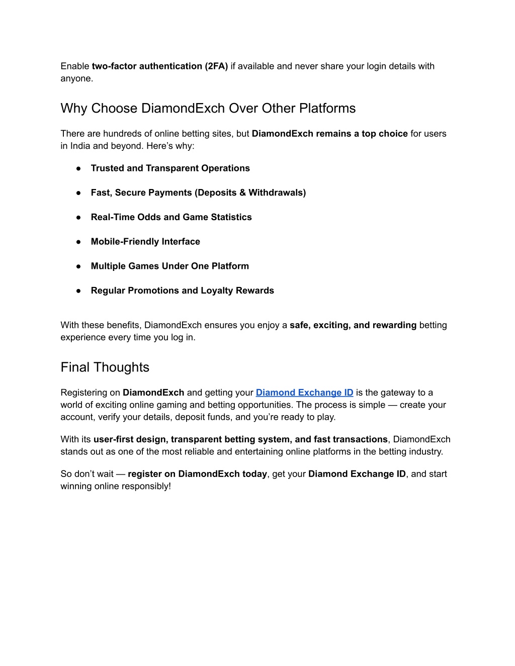 Enable two-factor authentication (2FA) if available and never share your login details with anyone. Why Choose DiamondExch Over Other Platforms There are hundreds of online betting sites, but DiamondExch remains a top choice for users in India and beyond. Here’s why: ● Trusted and Transparent Operations ● Fast, Secure Payments (Deposits & Withdrawals) ● Real-Time Odds and Game Statistics ● Mobile-Friendly Interface ● Multiple Games Under One Platform ● Regular Promotions and Loyalty Rewards With these benefits, DiamondExch ensures you enjoy a safe, exciting, and rewarding betting experience every time you log in. Final Thoughts Registering on DiamondExch and getting your Diamond Exchange ID is the gateway to a world of exciting online gaming and betting opportunities. The process is simple — create your account, verify your details, deposit funds, and you’re ready to play. With its user-first design, transparent betting system, and fast transactions, DiamondExch stands out as one of the most reliable and entertaining online platforms in the betting industry. So don’t wait — register on DiamondExch today, get your Diamond Exchange ID, and start winning online responsibly!