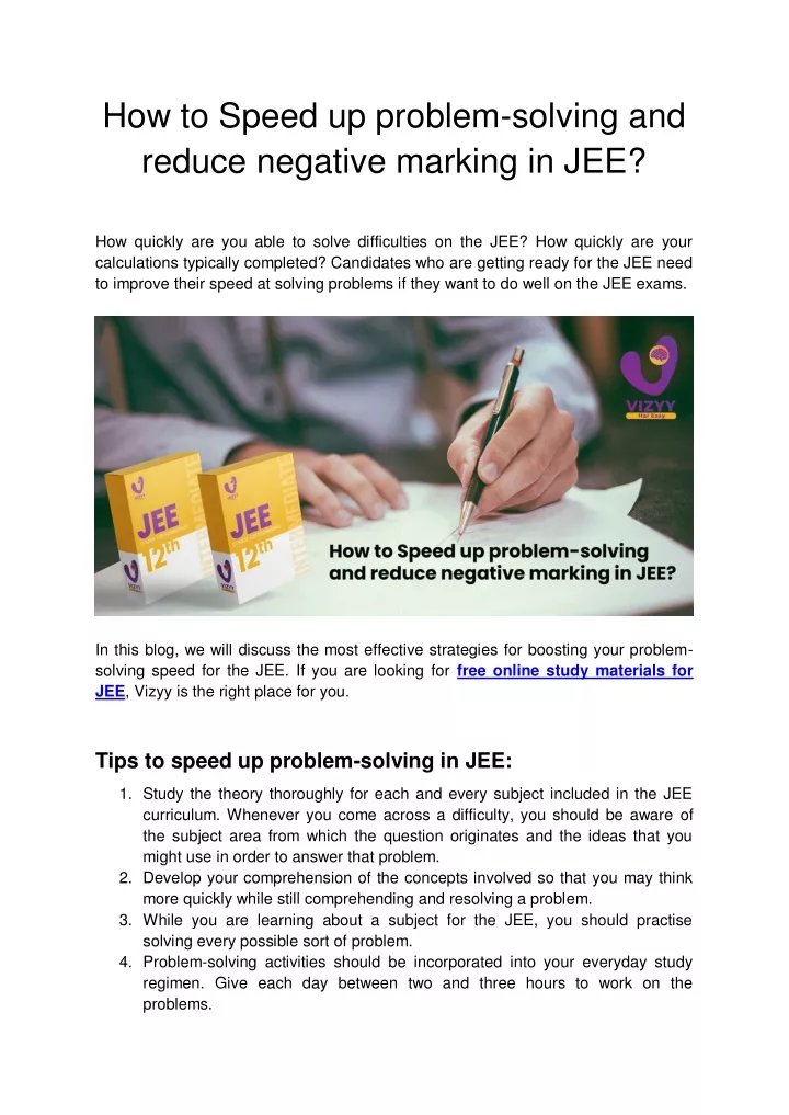 How to Speed up problem-solving and reduce negative marking in JEE? How quickly are you able to solve difficulties on the JEE? How quickly are your calculations typically completed? Candidates who are getting ready for the JEE need to improve their speed at solving problems if they want to do well on the JEE exams. In this blog, we will discuss the most effective strategies for boosting your problem- solving speed for the JEE. If you are looking for free online study materials for JEE, Vizyy is the right place for you. Tips to speed up problem-solving in JEE: 1. Study the theory thoroughly for each and every subject included in the JEE curriculum. Whenever you come across a difficulty, you should be aware of the subject area from which the question originates and the ideas that you might use in order to answer that problem. 2. Develop your comprehension of the concepts involved so that you may think more quickly while still comprehending and resolving a problem. 3. While you are learning about a subject for the JEE, you should practise solving every possible sort of problem. 4. Problem-solving activities should be incorporated into your everyday study regimen. Give each day between two and three hours to work on the problems.