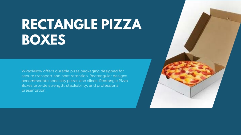 RECTANGLE PIZZA BOXES WPackNow offers durable pizza packaging designed for secure transport and heat retention. Rectangular designs accommodate specialty pizzas and slices. Rectangle Pizza Boxes provide strength, stackability, and professional presentation,