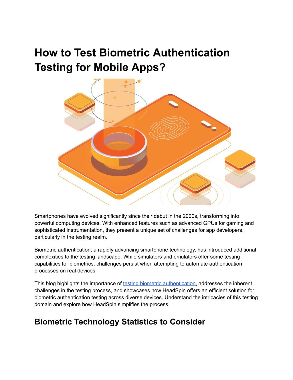 How to Test Biometric Authentication Testing for Mobile Apps? Smartphones have evolved significantly since their debut in the 2000s, transforming into powerful computing devices. With enhanced features such as advanced GPUs for gaming and sophisticated instrumentation, they present a unique set of challenges for app developers, particularly in the testing realm. Biometric authentication, a rapidly advancing smartphone technology, has introduced additional complexities to the testing landscape. While simulators and emulators offer some testing capabilities for biometrics, challenges persist when attempting to automate authentication processes on real devices. This blog highlights the importance of testing biometric authentication, addresses the inherent challenges in the testing process, and showcases how HeadSpin offers an efficient solution for biometric authentication testing across diverse devices. Understand the intricacies of this testing domain and explore how HeadSpin simplifies the process. Biometric Technology Statistics to Consider
