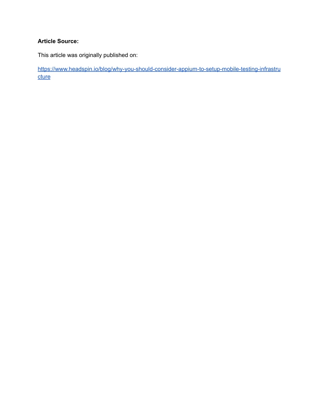 Article Source: This article was originally published on: https://www.headspin.io/blog/why-you-should-consider-appium-to-setup-mobile-testing-infrastru cture