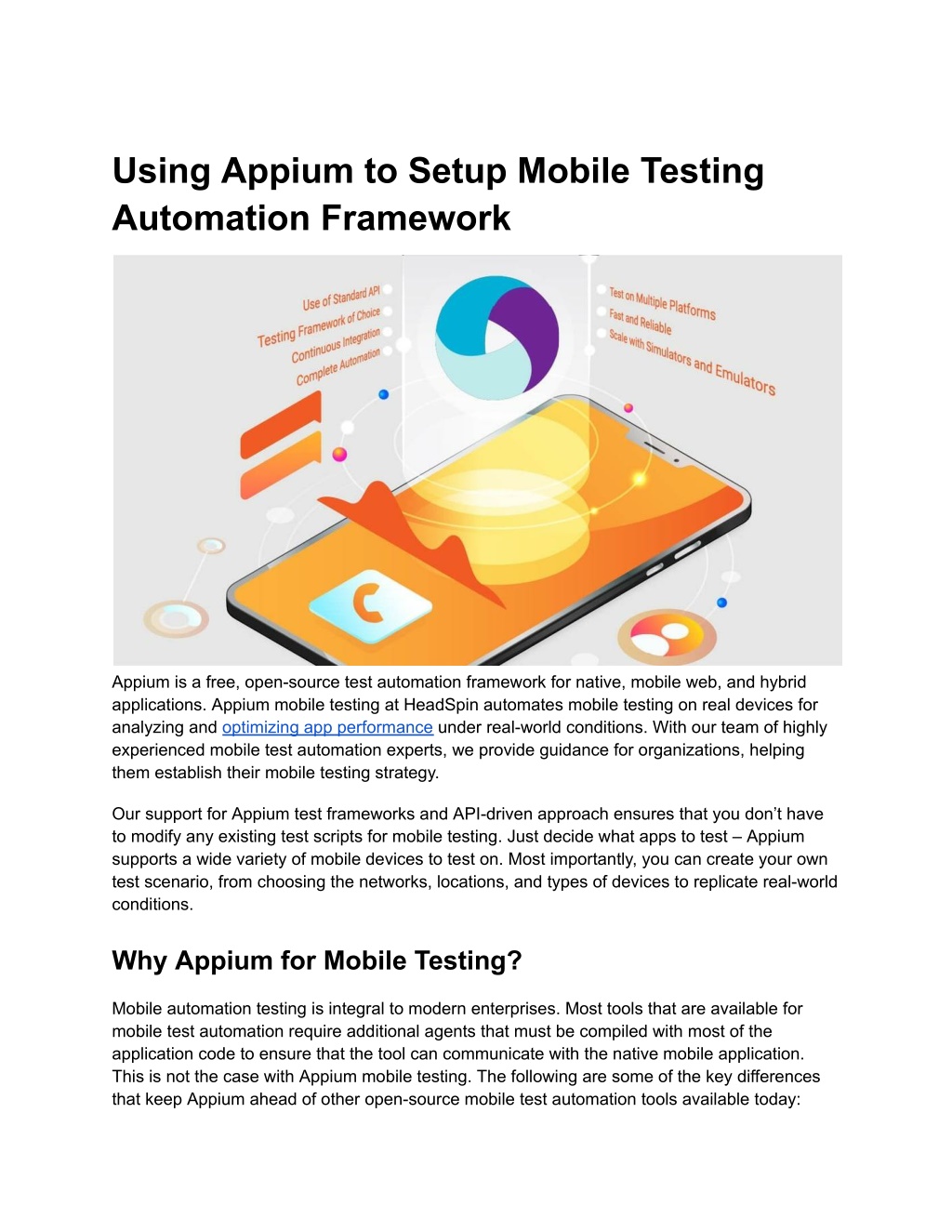 Using Appium to Setup Mobile Testing Automation Framework Appium is a free, open-source test automation framework for native, mobile web, and hybrid applications. Appium mobile testing at HeadSpin automates mobile testing on real devices for analyzing and optimizing app performance under real-world conditions. With our team of highly experienced mobile test automation experts, we provide guidance for organizations, helping them establish their mobile testing strategy. Our support for Appium test frameworks and API-driven approach ensures that you don’t have to modify any existing test scripts for mobile testing. Just decide what apps to test – Appium supports a wide variety of mobile devices to test on. Most importantly, you can create your own test scenario, from choosing the networks, locations, and types of devices to replicate real-world conditions. Why Appium for Mobile Testing? Mobile automation testing is integral to modern enterprises. Most tools that are available for mobile test automation require additional agents that must be compiled with most of the application code to ensure that the tool can communicate with the native mobile application. This is not the case with Appium mobile testing. The following are some of the key differences that keep Appium ahead of other open-source mobile test automation tools available today:
