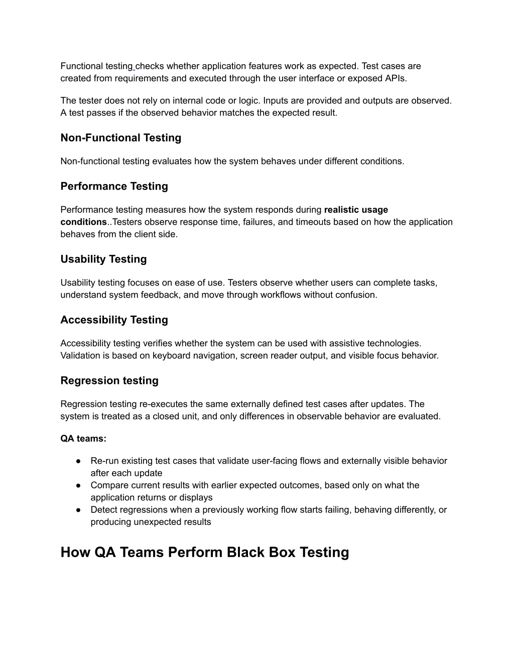 Functional testing checks whether application features work as expected. Test cases are created from requirements and executed through the user interface or exposed APIs. The tester does not rely on internal code or logic. Inputs are provided and outputs are observed. A test passes if the observed behavior matches the expected result. Non-Functional Testing Non-functional testing evaluates how the system behaves under different conditions. Performance Testing Performance testing measures how the system responds during realistic usage conditions..Testers observe response time, failures, and timeouts based on how the application behaves from the client side. Usability Testing Usability testing focuses on ease of use. Testers observe whether users can complete tasks, understand system feedback, and move through workflows without confusion. Accessibility Testing Accessibility testing verifies whether the system can be used with assistive technologies. Validation is based on keyboard navigation, screen reader output, and visible focus behavior. Regression testing Regression testing re-executes the same externally defined test cases after updates. The system is treated as a closed unit, and only differences in observable behavior are evaluated. QA teams: ● Re-run existing test cases that validate user-facing flows and externally visible behavior after each update ● Compare current results with earlier expected outcomes, based only on what the application returns or displays ● Detect regressions when a previously working flow starts failing, behaving differently, or producing unexpected results How QA Teams Perform Black Box Testing