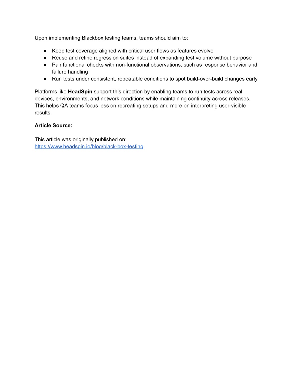Upon implementing Blackbox testing teams, teams should aim to: ● Keep test coverage aligned with critical user flows as features evolve ● Reuse and refine regression suites instead of expanding test volume without purpose ● Pair functional checks with non-functional observations, such as response behavior and failure handling ● Run tests under consistent, repeatable conditions to spot build-over-build changes early Platforms like HeadSpin support this direction by enabling teams to run tests across real devices, environments, and network conditions while maintaining continuity across releases. This helps QA teams focus less on recreating setups and more on interpreting user-visible results. Article Source: This article was originally published on: https://www.headspin.io/blog/black-box-testing