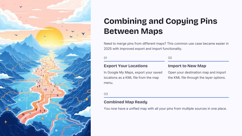 Combining and Copying Pins Between Maps Need to merge pins from different maps? This common use case became easier in 2025 with improved export and import functionality. 01 02 Export Your Locations Import to New Map In Google My Maps, export your saved locations as a KML file from the map menu. Open your destination map and import the KML file through the layer options. 03 Combined Map Ready You now have a unified map with all your pins from multiple sources in one place.