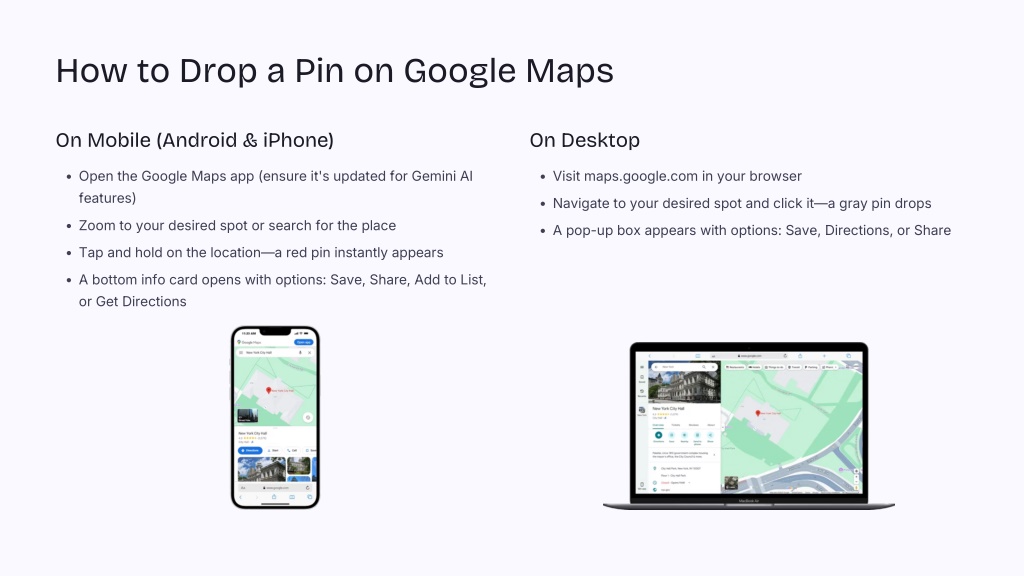 How to Drop a Pin on Google Maps On Mobile (Android & iPhone) On Desktop Open the Google Maps app (ensure it's updated for Gemini AI features) Visit maps.google.com in your browser Navigate to your desired spot and click it—a gray pin drops Zoom to your desired spot or search for the place A pop-up box appears with options: Save, Directions, or Share Tap and hold on the location—a red pin instantly appears A bottom info card opens with options: Save, Share, Add to List, or Get Directions
