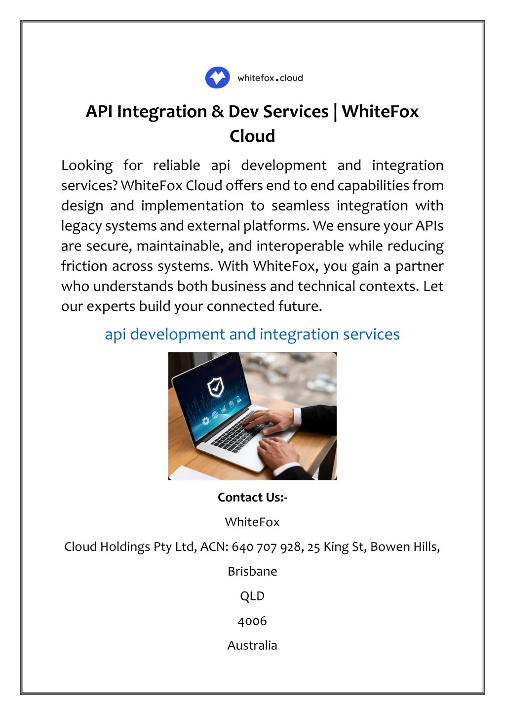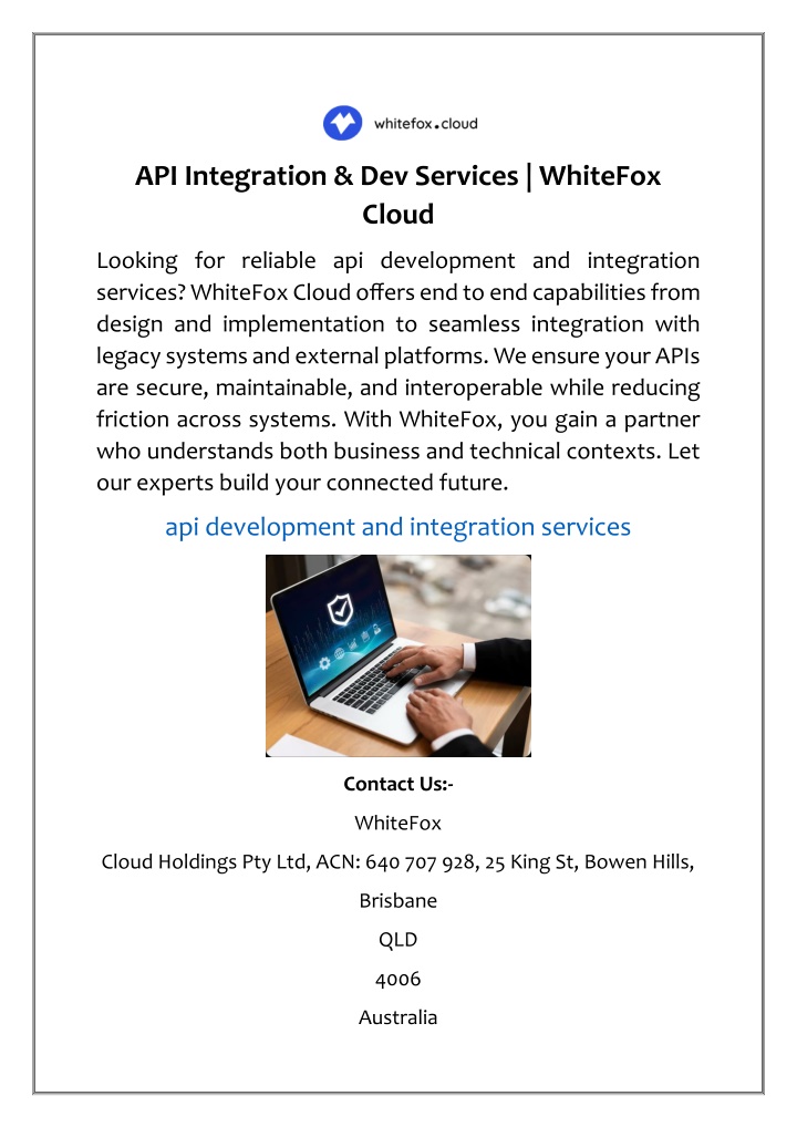 1. API Integration & Dev Services | WhiteFox Cloud Looking for reliable api development and integration services? WhiteFox Cloud offers end to end capabilities from design and implementation to seamless integration with legacy systems and external platforms. We ensure your APIs are secure, maintainable, and interoperable while reducing friction across systems. With WhiteFox, you gain a partner who understands both business and technical contexts. Let our experts build your connected future. api development and integration services Contact Us:- WhiteFox Cloud Holdings Pty Ltd, ACN: 640 707 928, 25 King St, Bowen Hills, Brisbane QLD 4006 Australia