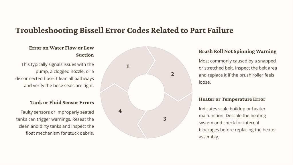 Troubleshooting Bissell Error Codes Related to Part Failure Error on Water Flow or Low Brush Roll Not Spinning Warning Suction Most commonly caused by a snapped or stretched belt. Inspect the belt area and replace it if the brush roller feels loose. This typically signals issues with the pump, a clogged nozzle, or a disconnected hose. Clean all pathways and verify the hose seals are tight. 1 2 Heater or Temperature Error Tank or Fluid Sensor Errors Indicates scale buildup or heater malfunction. Descale the heating system and check for internal blockages before replacing the heater assembly. 4 Faulty sensors or improperly seated tanks can trigger warnings. Reseat the clean and dirty tanks and inspect the float mechanism for stuck debris. 3