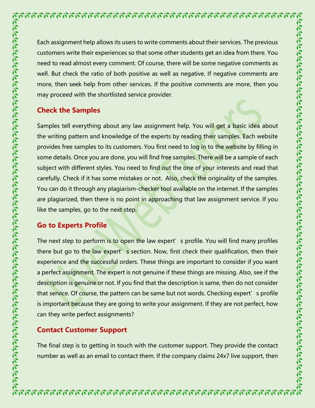 Each assignment help allows its users to write comments about their services. The previous customers write their experiences so that some other students get an idea from there. You need to read almost every comment. Of course, there will be some negative comments as well. But check the ratio of both positive as well as negative. If negative comments are more, then seek help from other services. If the positive comments are more, then you may proceed with the shortlisted service provider. Check the Samples Samples tell everything about any law assignment help.You will get a basic idea about the writing pattern and knowledge of the experts by reading their samples. Each website provides free samples to its customers. You first need to log in to the website by filling in some details. Once you are done, you will find free samples. There will be a sample of each subject with different styles. You need to find out the one of your interests and read that carefully. Check if it has some mistakes or not. Also, check the originality of the samples. You can do it through any plagiarism-checker tool available on the internet. If the samples are plagiarized, then there is no point in approaching that law assignment service. If you like the samples, go to the next step. Go to Experts Profile The next step to perform is to open the law expert’s profile. You will find many profiles there but go to the law expert’s section. Now, first check their qualification, then their experience and the successful orders. These things are important to consider if you want a perfect assignment. The expert is not genuine if these things are missing. Also, see if the description is genuine or not. If you find that the description is same, then do not consider that service. Of course, the pattern can be same but not words. Checking expert’s profile is important because they are going to write your assignment. If they are not perfect, how can they write perfect assignments? Contact Customer Support The final step is to getting in touch with the customer support. They provide the contact number as well as an email to contact them. If the company claims 24x7 live support, then
