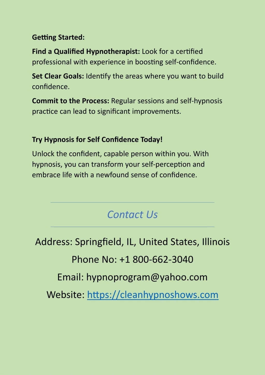 Getting Started: Find a Qualified Hypnotherapist: Look for a certified professional with experience in boosting self-confidence. Set Clear Goals: Identify the areas where you want to build confidence. Commit to the Process: Regular sessions and self-hypnosis practice can lead to significant improvements. Try Hypnosis for Self Confidence Today! Unlock the confident, capable person within you. With hypnosis, you can transform your self-perception and embrace life with a newfound sense of confidence. Contact Us Address: Springfield, IL, United States, Illinois Phone No: +1 800-662-3040 Email: hypnoprogram@yahoo.com Website: https://cleanhypnoshows.com