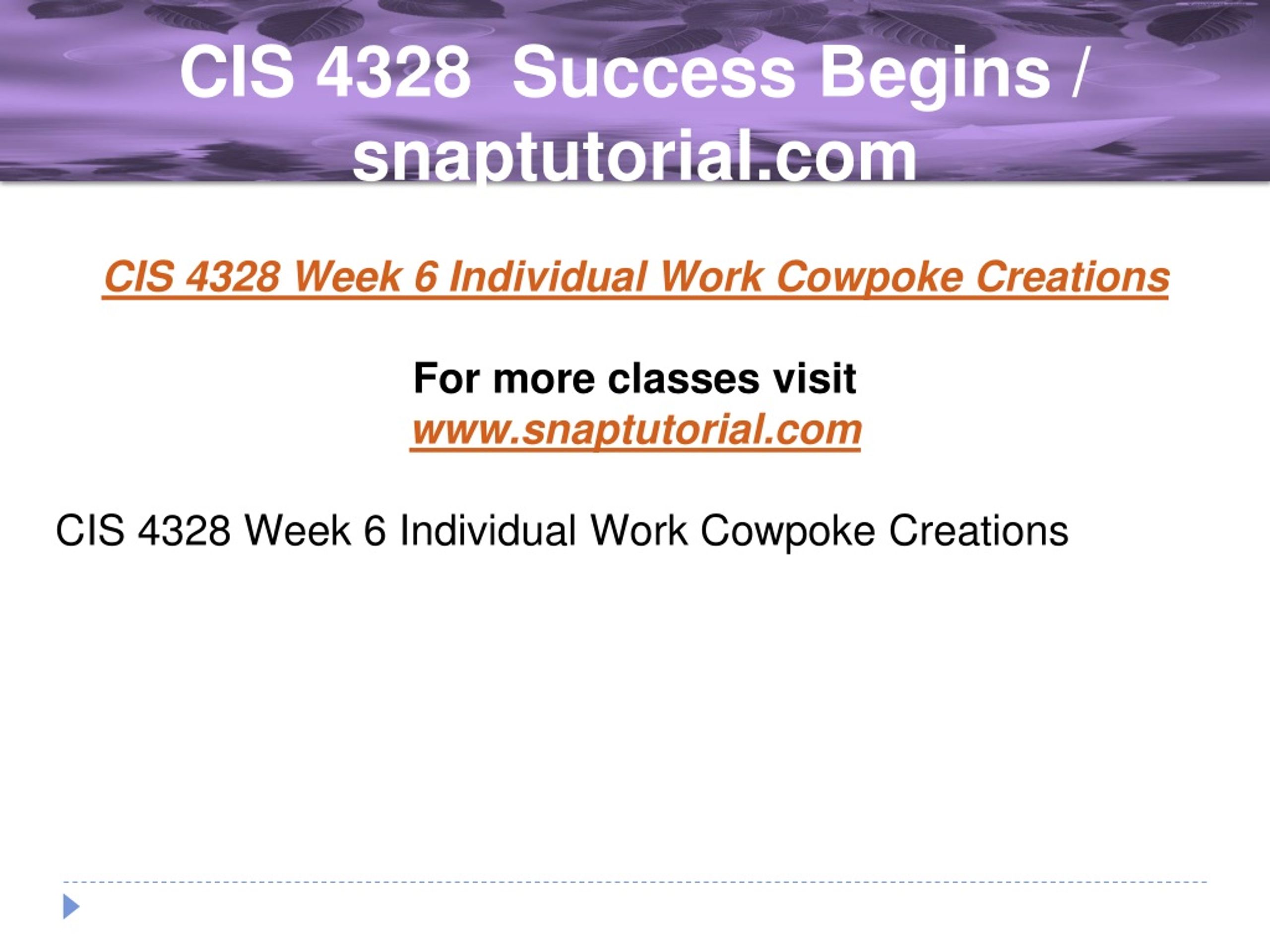 CIS 4328 Success Begins / snaptutorial.com CIS 4328 Week 6 Individual Work Cowpoke Creations For more classes visit www.snaptutorial.com CIS 4328 Week 6 Individual Work Cowpoke Creations
