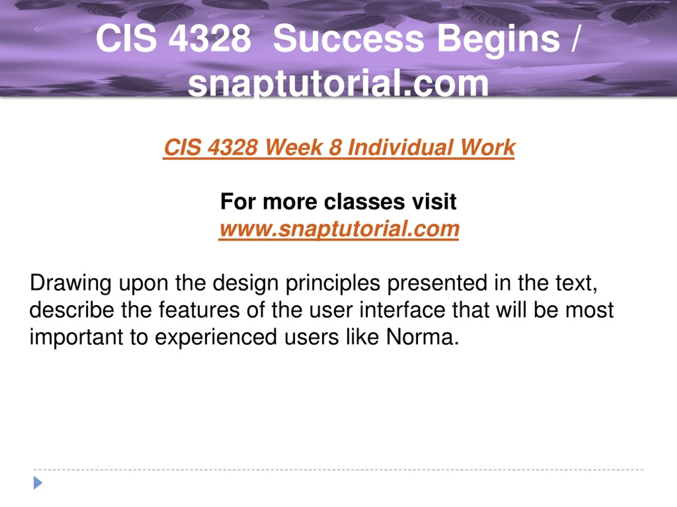 CIS 4328 Success Begins / snaptutorial.com CIS 4328 Week 8 Individual Work For more classes visit www.snaptutorial.com Drawing upon the design principles presented in the text, describe the features of the user interface that will be most important to experienced users like Norma.