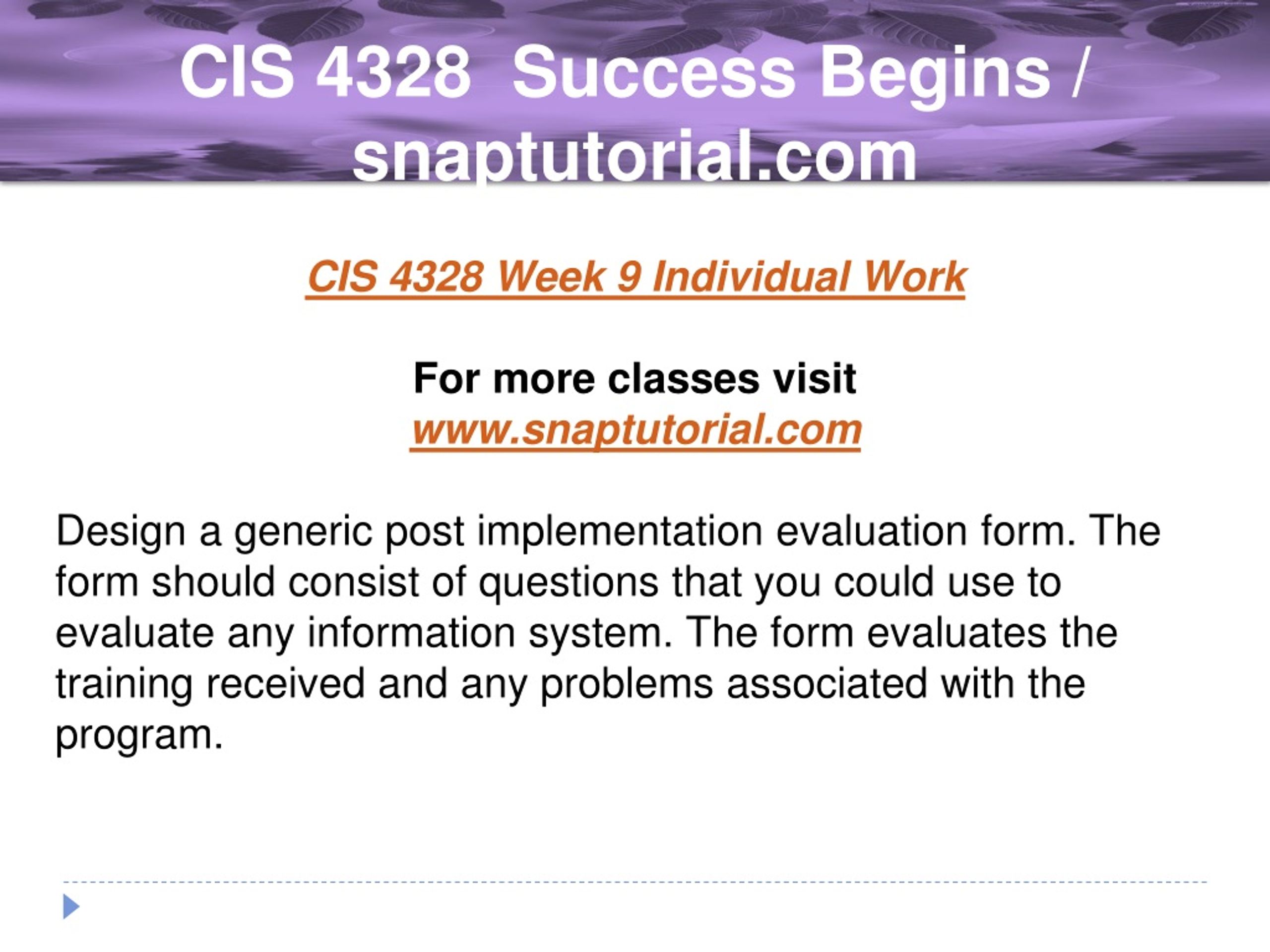 CIS 4328 Success Begins / snaptutorial.com CIS 4328 Week 9 Individual Work For more classes visit www.snaptutorial.com Design a generic post implementation evaluation form. The form should consist of questions that you could use to evaluate any information system. The form evaluates the training received and any problems associated with the program.