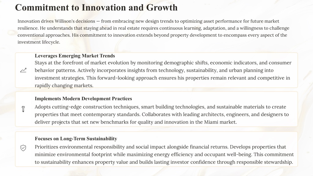 Commitment to Innovation and Growth Innovation drives Willison's decisions — from embracing new design trends to optimizing asset performance for future market resilience. He understands that staying ahead in real estate requires continuous learning, adaptation, and a willingness to challenge conventional approaches. His commitment to innovation extends beyond property development to encompass every aspect of the investment lifecycle. Leverages Emerging Market Trends Stays at the forefront of market evolution by monitoring demographic shifts, economic indicators, and consumer behavior patterns. Actively incorporates insights from technology, sustainability, and urban planning into investment strategies. This forward-looking approach ensures his properties remain relevant and competitive in rapidly changing markets. Implements Modern Development Practices Adopts cutting-edge construction techniques, smart building technologies, and sustainable materials to create properties that meet contemporary standards. Collaborates with leading architects, engineers, and designers to deliver projects that set new benchmarks for quality and innovation in the Miami market. Focuses on Long-Term Sustainability Prioritizes environmental responsibility and social impact alongside financial returns. Develops properties that minimize environmental footprint while maximizing energy efficiency and occupant well-being. This commitment to sustainability enhances property value and builds lasting investor confidence through responsible stewardship.